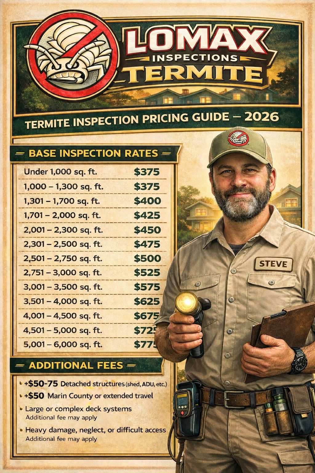 Lomax Termite Control of Sonoma, also servicing Santa Rosa, Petaluma, Napa, and other portions of Sonoma, Napa, and Marin Counties, California is a local, family-owned and operated industry leader delivering termite treatments and home inspections to residents of Sonoma, Napa, and Marin counties since 2005. LOMAX has long been known for providing LOwer prices and MAXimum service. We are fully licensed, bonded, and insured. On our official site, you can request a free estimate or order an inspection, learn about our company, read about the services that we offer, obtain information about the products we use in our treatments, and contact us for further information. Thank you for visiting our site and we hope to have the opportunity to provide great service to keep your home looking beautiful in the near future. Some of our services include…